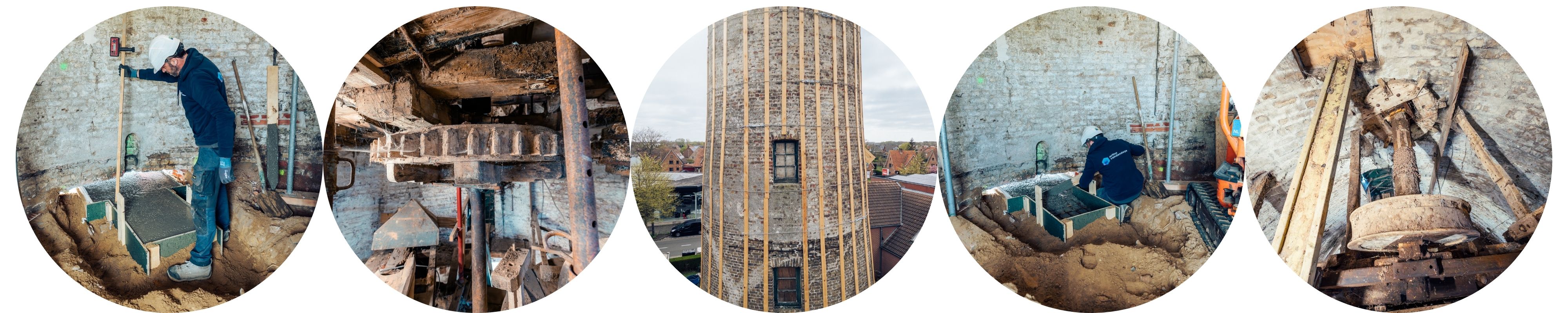 Voor de start van de werken werd de buitenzijde van de molen verstevigd met houten latten en stalen kabels. Deze ingreep verdeelt de krachten gelijkmatig en stabiliseert het gebouw. De funderingswerken zijn uitgevoerd met micropalen en paalkoppen. Deze fundering dient als steun voor de nieuwe stalen constructie.